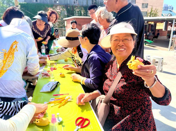 非遗李氏花馍区的玉兔、福字主题作品栩栩如生,传递着中秋吉祥寓意,惟妙惟肖的卡通形象吸引了居民们的关注和体验式学习,此外,粘豆包等特色美食受到了居民的欢迎。