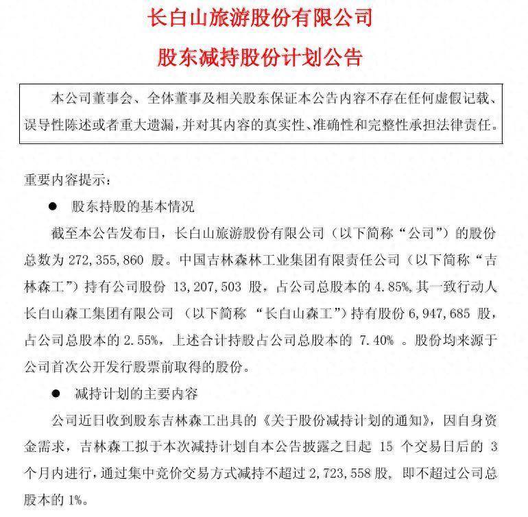 11月7日,长白山(603099)发布公告,中国吉林森林工业集团有限责任公司拟于2025年12月1日至2026年2月28日期间老钱庄,通过集中竞价交易方式减持不超过272万股,即不超过公司总股本的1%。