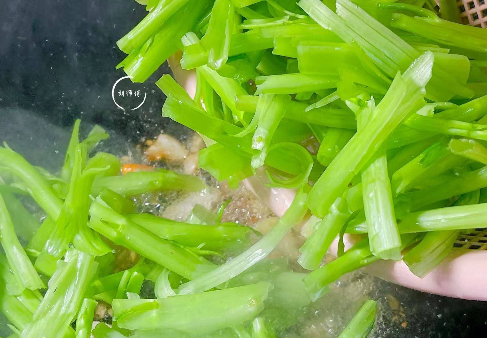3、通菜茎是比较吃油的一种蔬菜,所以炒的时候,要么多放一点食用油,要么多切一点肥肉。