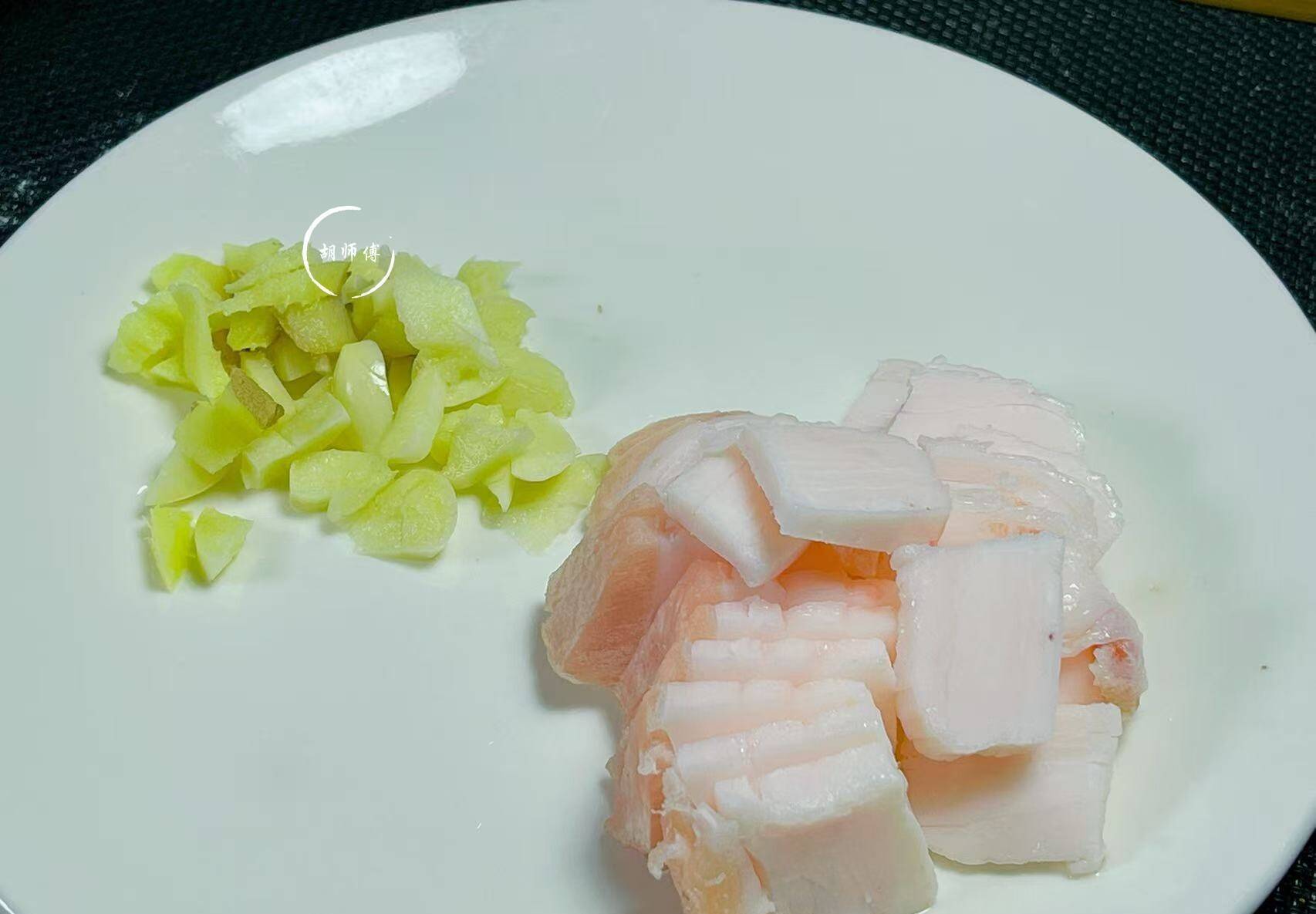 第三步:把肥肉洗净后切成片,然后将大蒜籽、老姜都切成碎末备用,喜欢吃辣的,还可以切2个干辣椒,不喜欢吃的,也可以不放。
