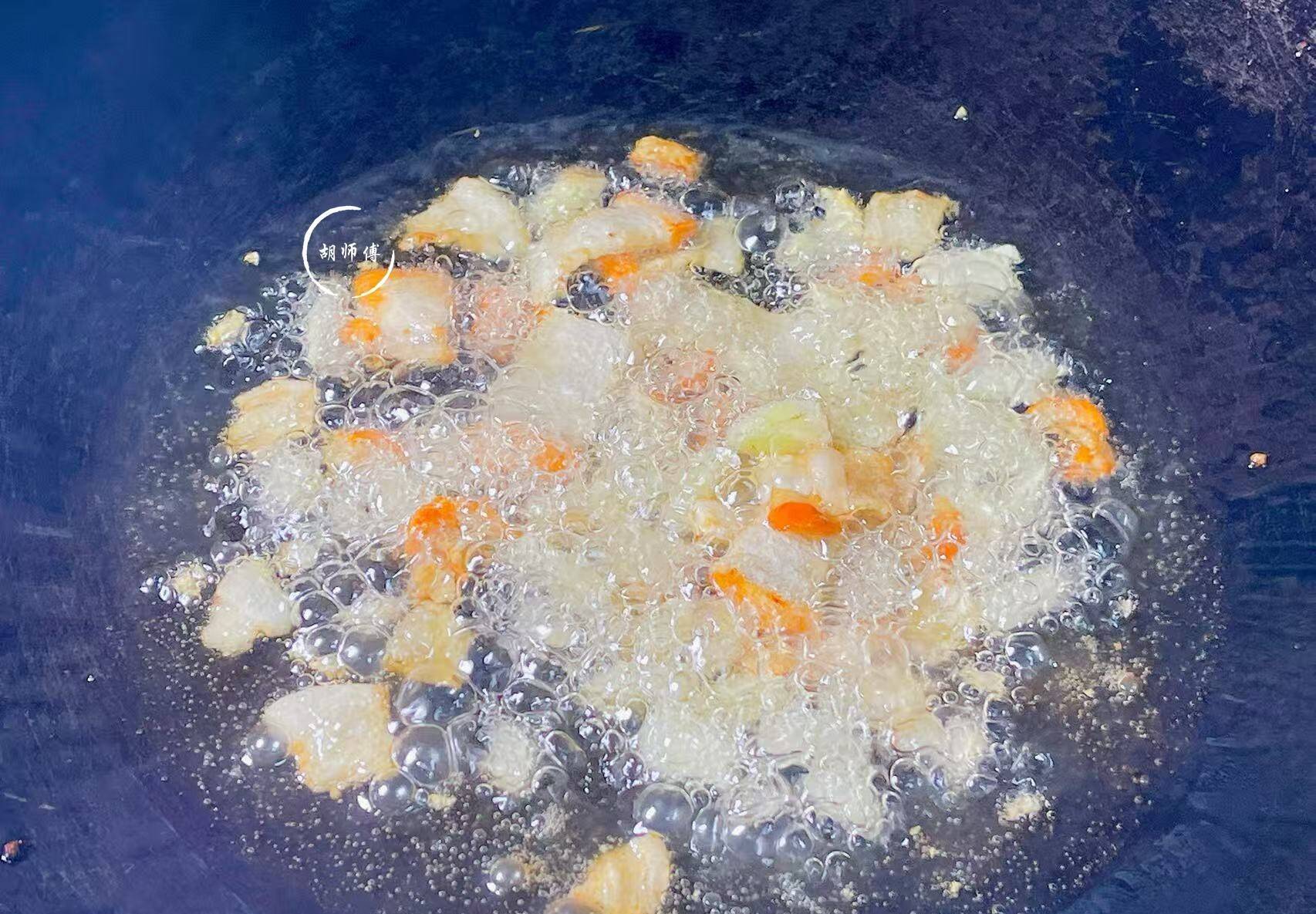 第四步:锅中放入一点点油,然后把肥肉放入锅中,大火将肥肉炸成浅黄色后,接着将蒜末、姜末放入锅中炸3秒,这样可以彻底激发出它们的香味。