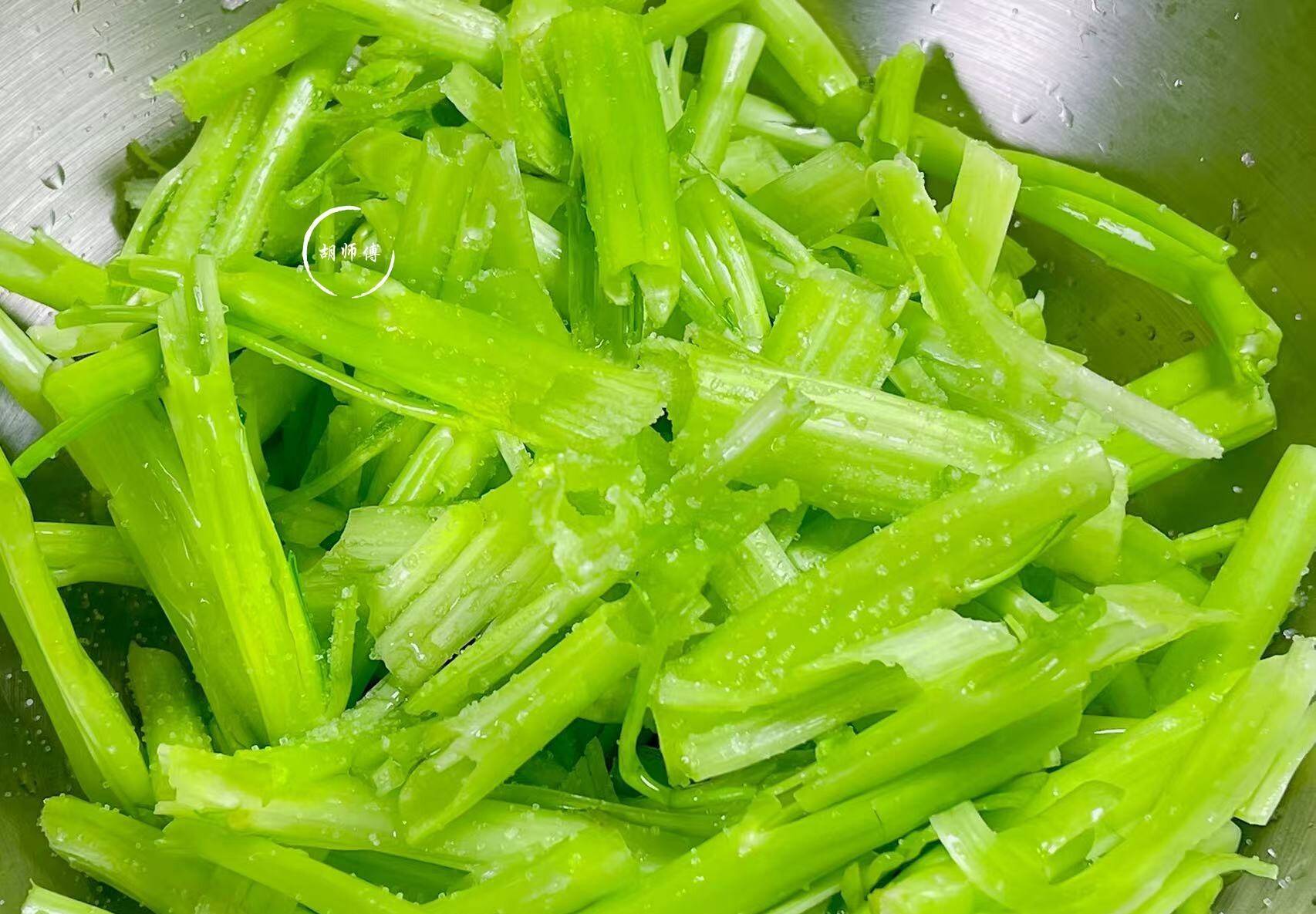 第二步:把通菜茎表面的水全部都沥干,然后将一点点食盐放入通菜茎中搅拌均匀,接着将通菜茎腌制5分钟后,再用自来水将通菜茎冲洗干净。